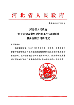 2005年9月,省国资委向省政府呈报《关于河北圣仑国际实业集团股份有限公司组建方案有关问题的请示》(冀国资呈〔2005〕151号),提出以圣仑公司为主体组建圣仑国际集团公司的方案。10月9日,省政府下发《河北省人民政府关于同意改组建立河北圣仑国际集团股份有限公司的批复》(冀政函〔2005〕117号),组建方案获得批准。